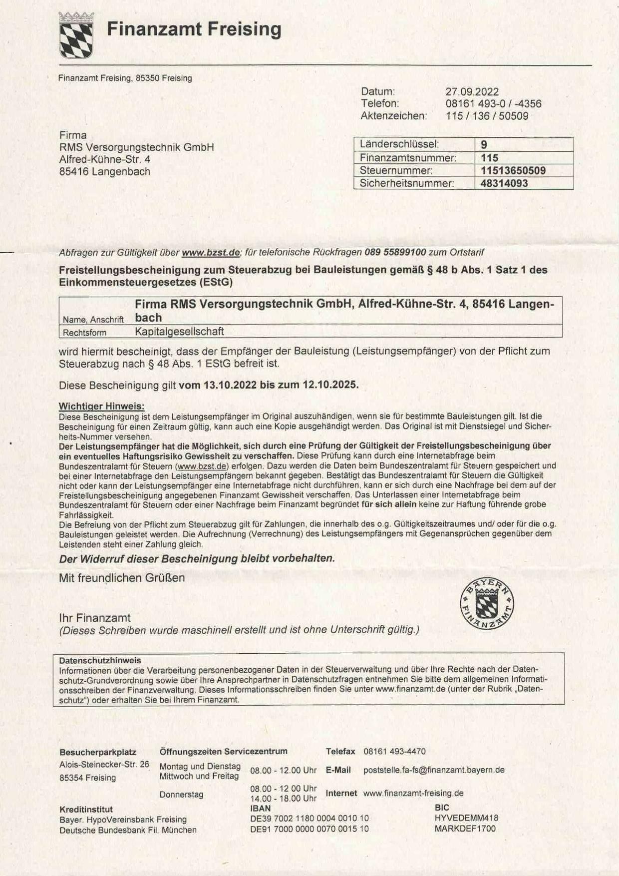 Downloads RMS VersorgungstechnikFreistellungs­bescheinigungen RMS Versorgungstechnik GmbH FB §48b EStG. PDF runterladen RMS Versorgungstechnik GmbH St.Sch. §13b UStG. PDF runterladen